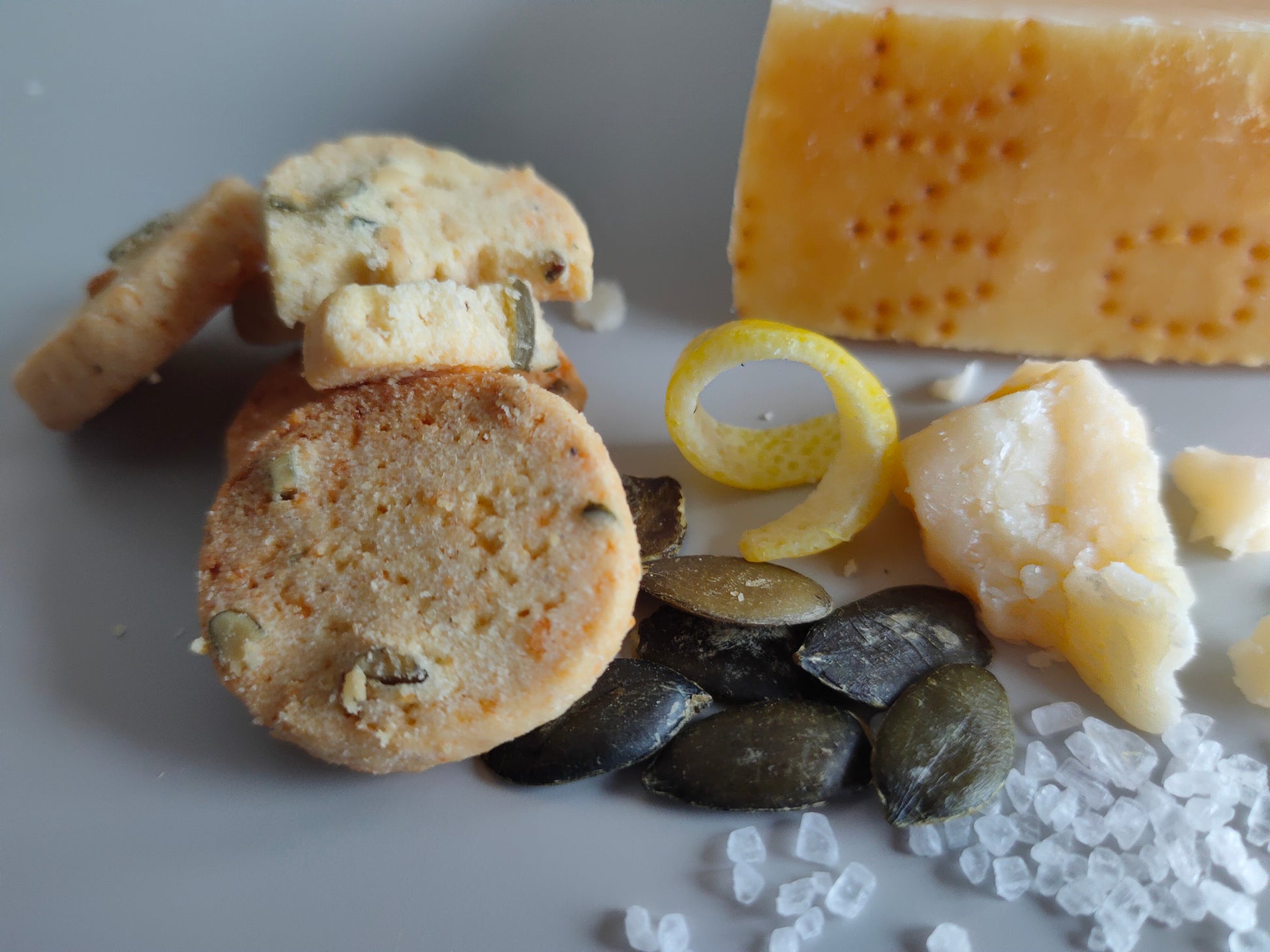 Imaginez un petit trésor de saveurs à decouvrir lors d'un apéritif : un petit biscuit salé au parmesan, parfumé au citron et enrichi de graines de citrouille. Chaque bouchée est une explosion de saveurs qui combine l'intensité du parmesan avec la fraîcheur du citron, créant un équilibre parfait.